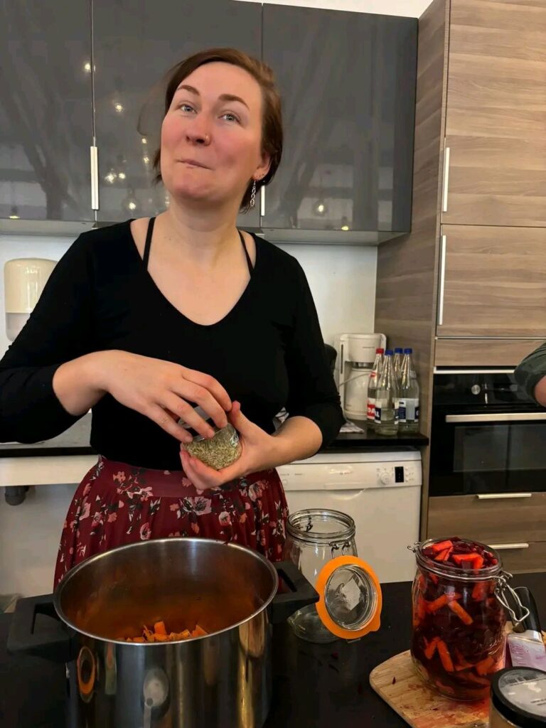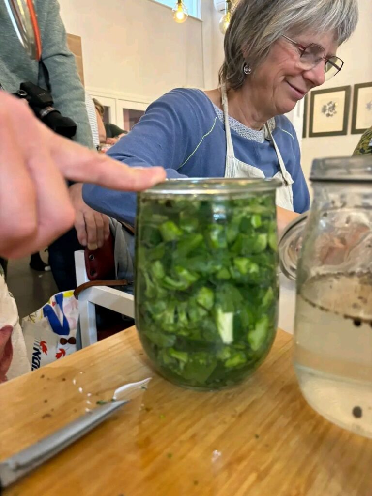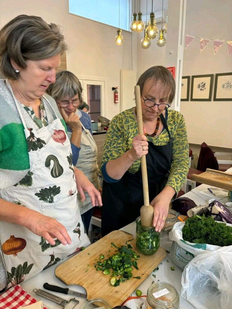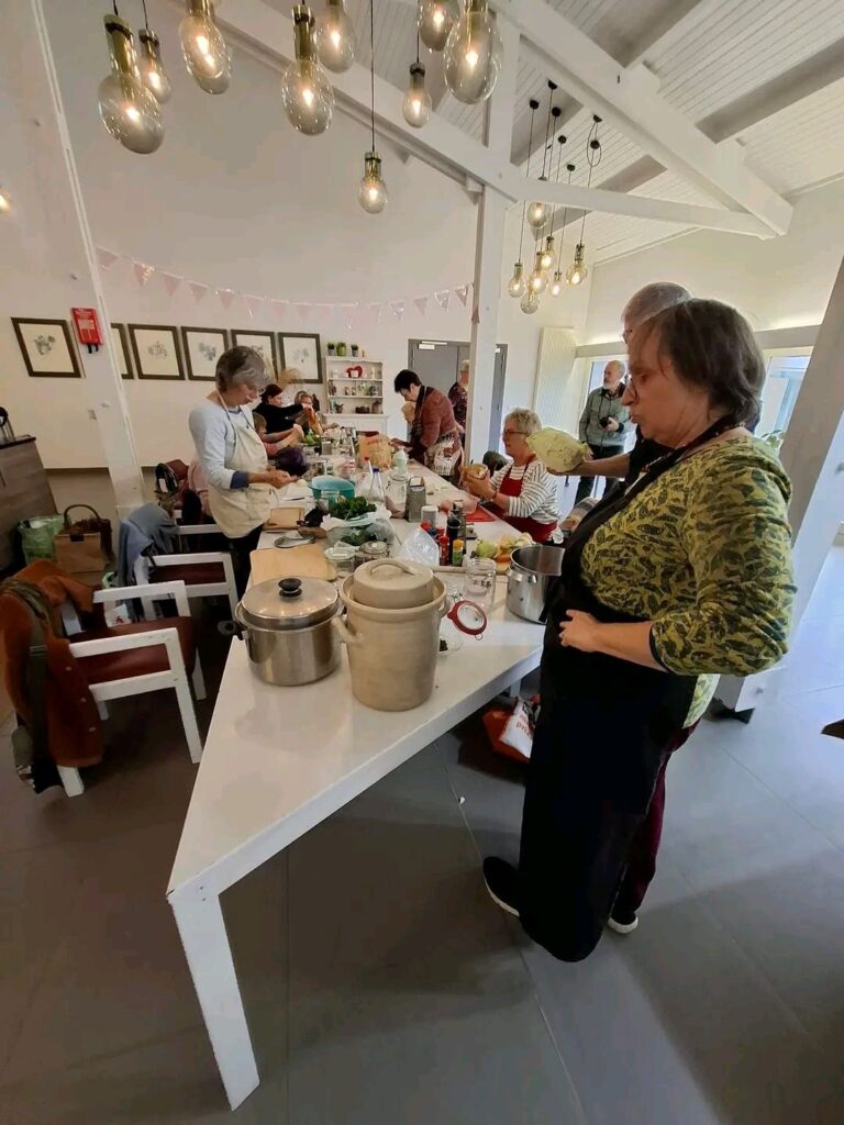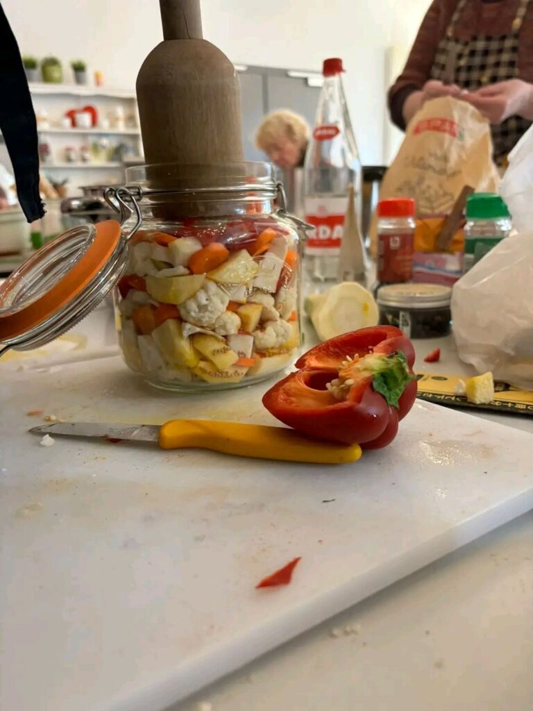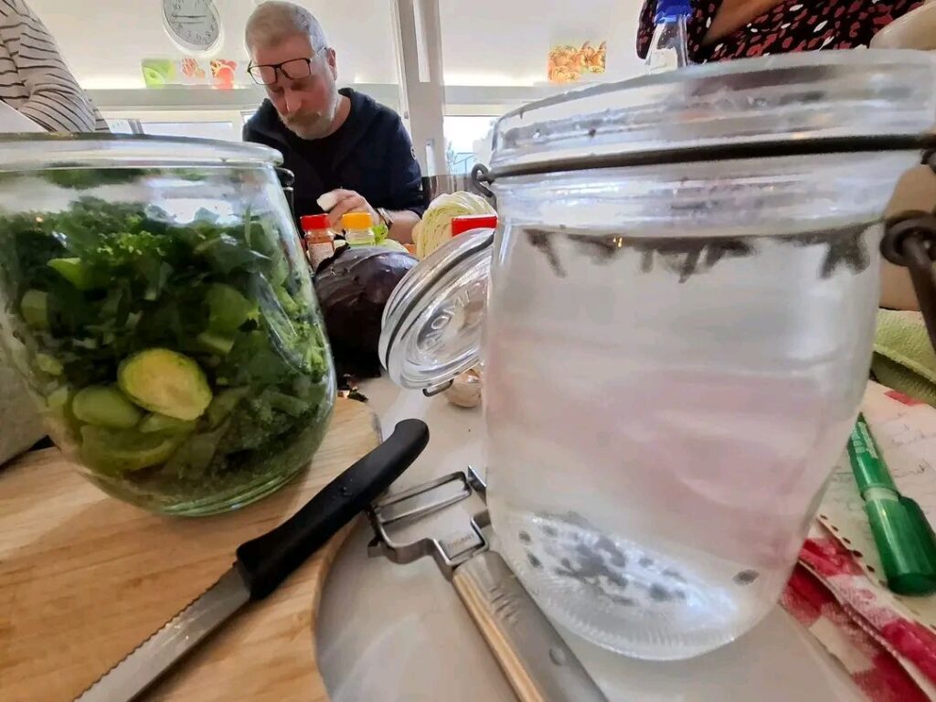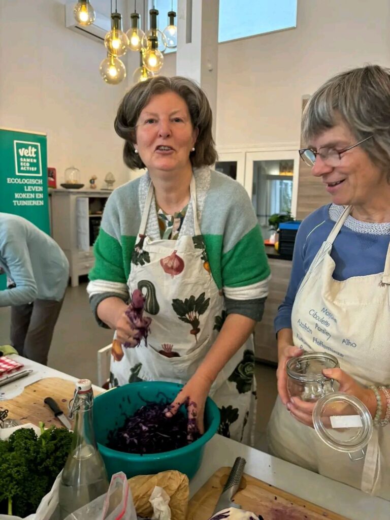 De keuken vulde zich met geuren van verse groenten en kruiden, maar ook met veel gelach en uitwisseling van ervaringen. Voor sommigen was het de eerste keer dat ze zelf gingen fermenteren, anderen hadden al wat ervaring en deelden hun tips. De sfeer was ontspannen en gezellig – precies zoals samen koken hoort te zijn!
