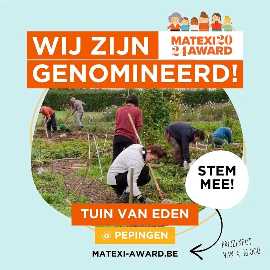 Vanaf 5 november kan je stemmen via www.matexi-award.be op Tuin Van Eden. Elke stem brengt ons dichter bij de overwinning en helpt ons om nog meer moois te realiseren in onze samentuin en voedselbos.