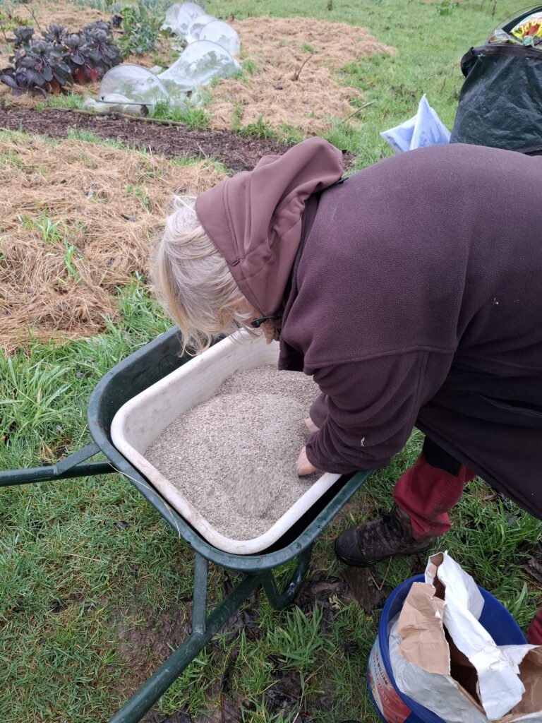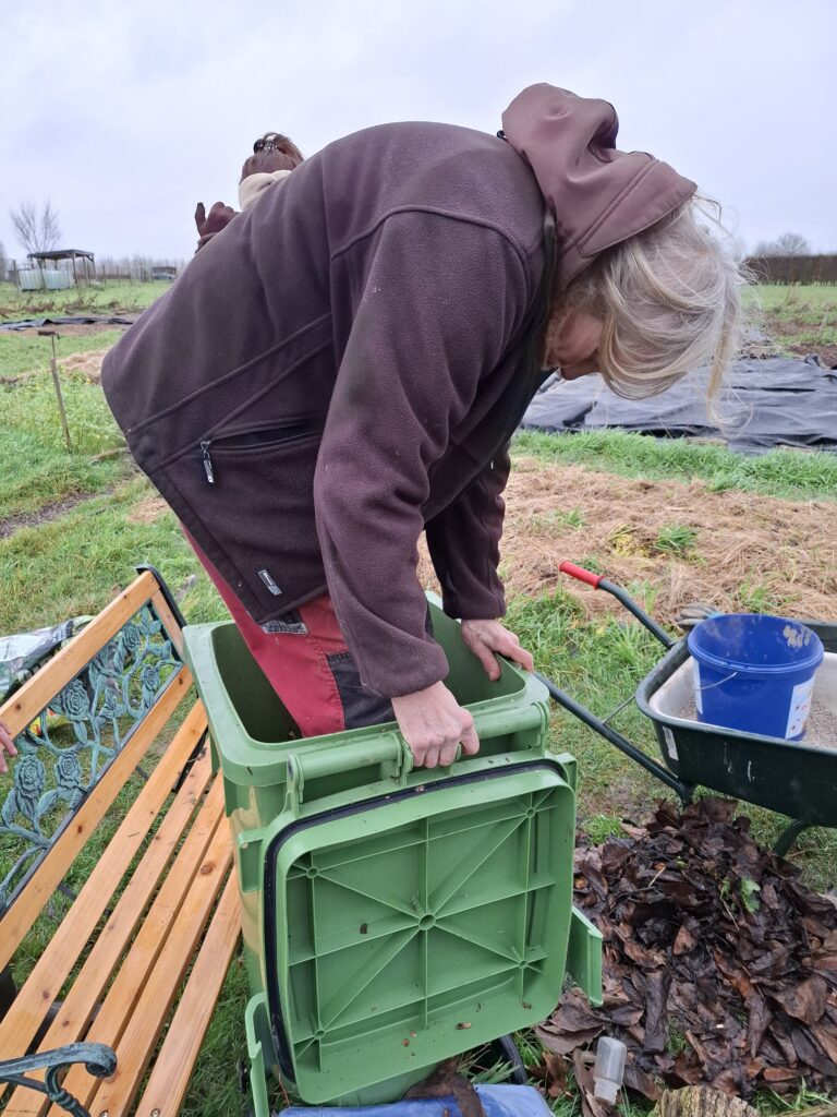 Op deze koude, maar droge winterdag verzamelden we bladeren in grote hopen en mengden we ze zorgvuldig met geactiveerde zemelen. Vervolgens stapelden we alles in lagen en dekten we het goed af. Over een paar maanden hebben we hiermee een rijke bodemverbeteraar die onze tuin volgend seizoen nieuw leven inblaast.